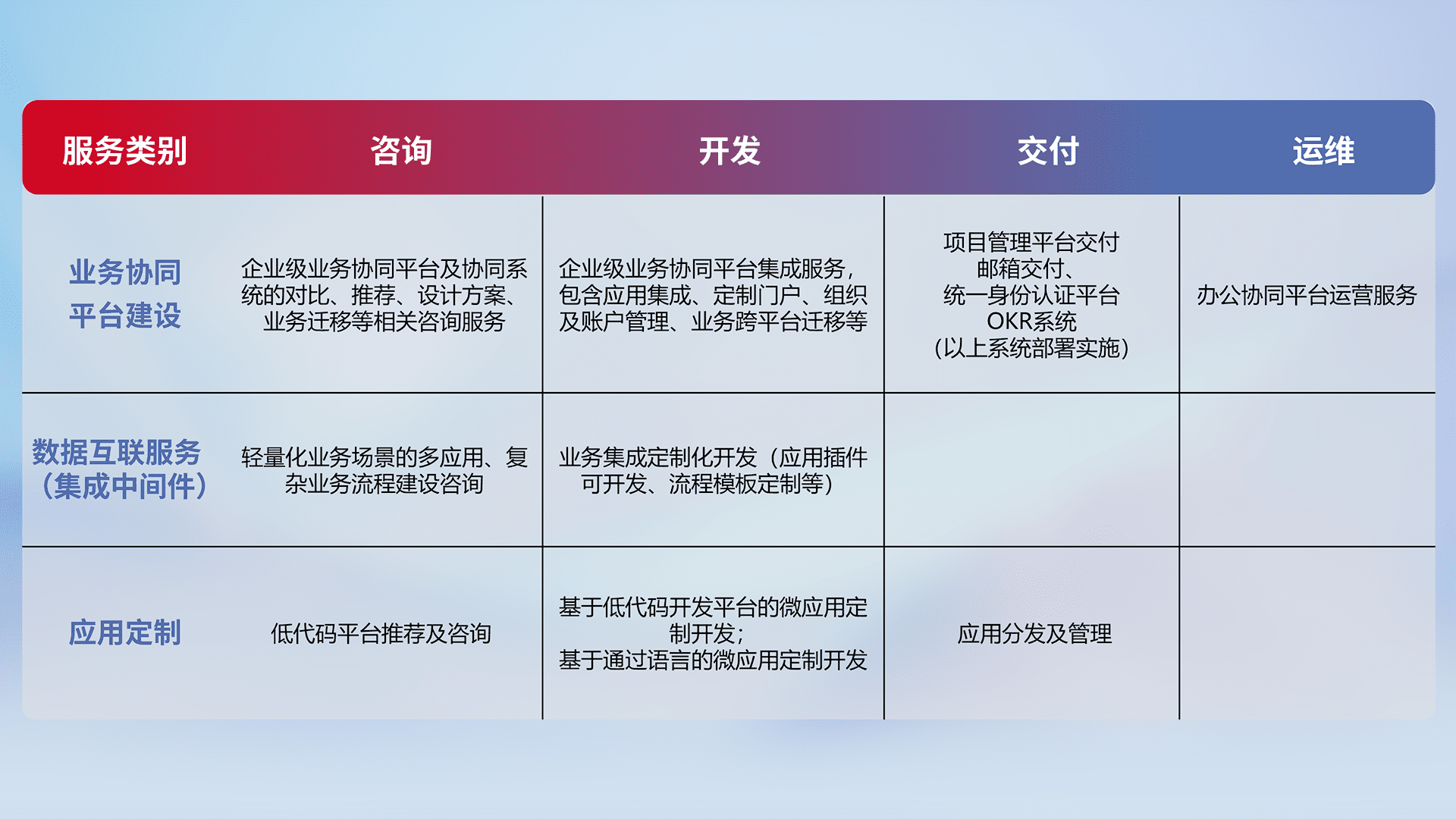 针对钉钉、、企微、、、IDaas等平台级产品提供产品的规划、、、方案、、交付、、、、定制化开发等服务,,,实现如统一协同办公、、、智能客户服务、、、混合会议管理、、、、智能数据查询、、、、等业务场景,,实现数字化转型。。。